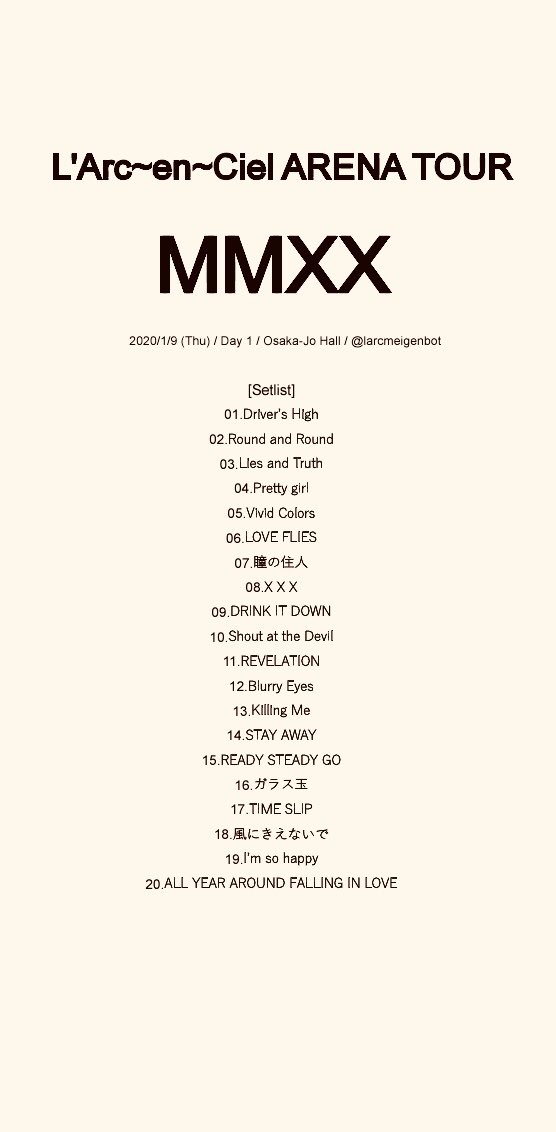 Neko On Twitter L Arc En Ciel Arena Tour Mmxx 2020 1 9 大阪城ホール セットリスト 演出も セトリもmcも何もかも 最高に やんちゃなラルク のツアー初日を目撃させてもらいました ッ Mmxx